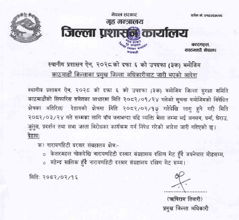 प्रशासनले सूचना निकालेर आजदेखि आउँदो असार २४ गतेसम्मका लागि पाँच जनाभन्दा बढी व्यक्ति भेला भई अनसन, धर्ना, घेराउ, जुलुस, प्रदर्शन तथा सभाजस्ता विरोधका कार्यक्रम गर्न निषेध गरिएको जानकारी दिएको हो ।