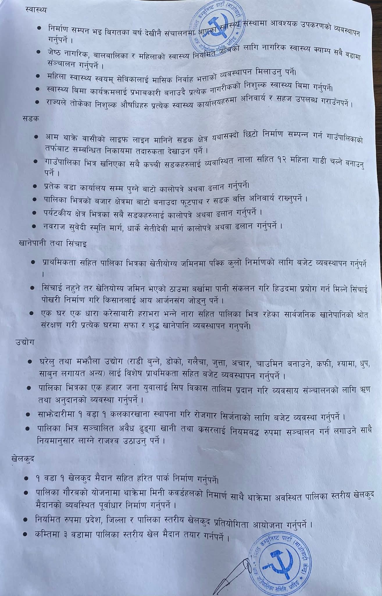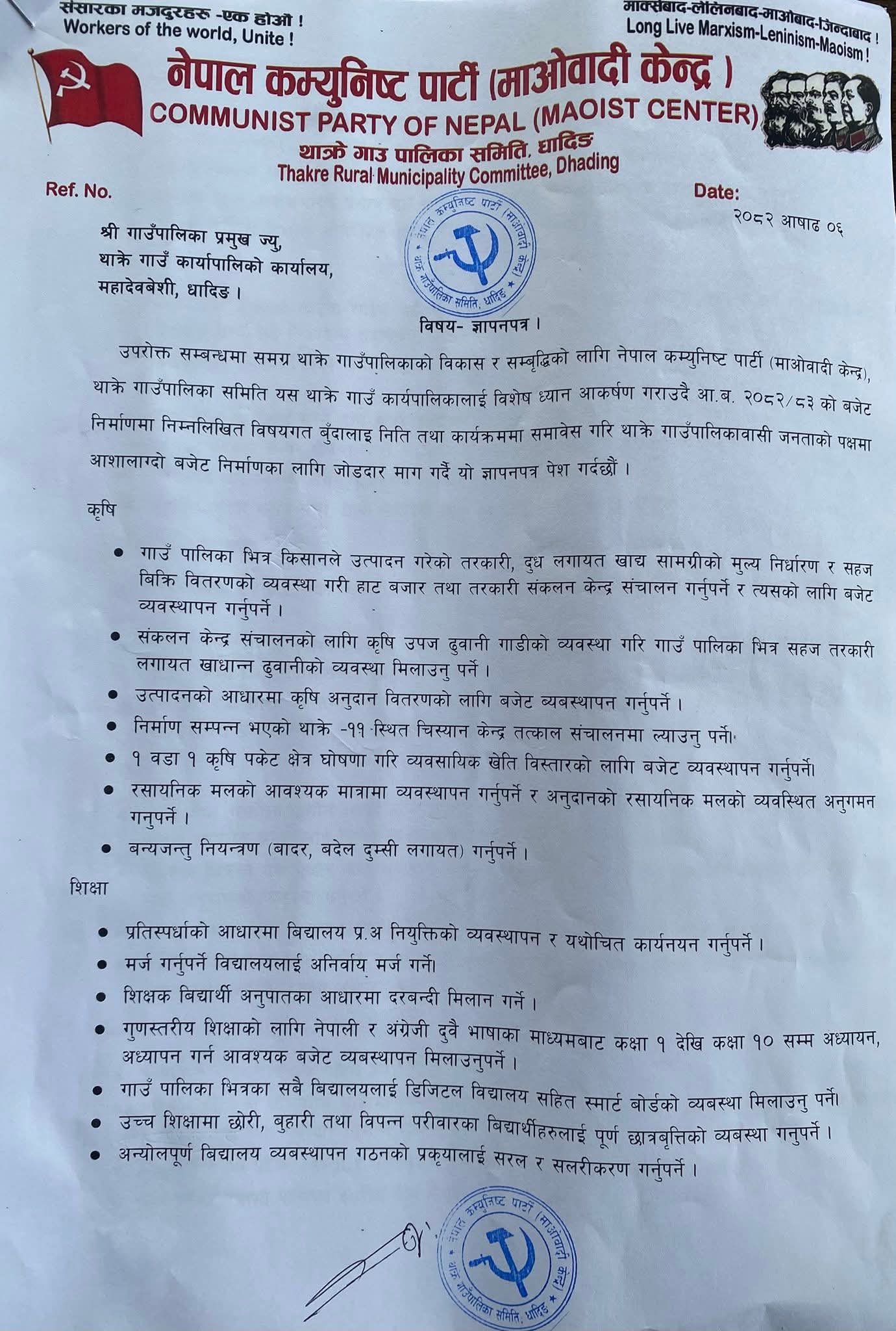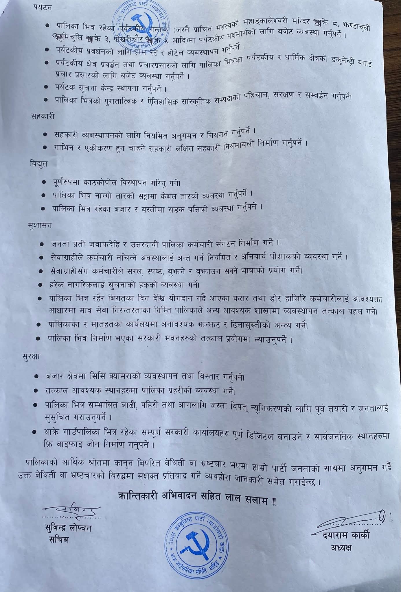 पार्टीका गाउँ समिति अध्यक्ष दयाराम कार्कीको नेतृत्वमा गएको टोलीले भ्रष्टाचार, अनियमितता, र व्यक्तिवादी प्रवृत्तिको अन्त्य गर्दै जनमुखी, पारदर्शी तथा विकासमुखी कार्यक्रम कार्यान्वयन गर्नुपर्ने माग राखेको छ। ज्ञापनपत्रमा विशेष गरी जनताको आधारभूत आवश्यकता, रोजगार, शिक्षा, स्वास्थ्य, खानेपानी, कृषि, सडक, महिला तथा पिछडिएको वर्गको सशक्तिकरण जस्ता विषयमा प्राथमिकता दिन आग्रह गरिएको छ।