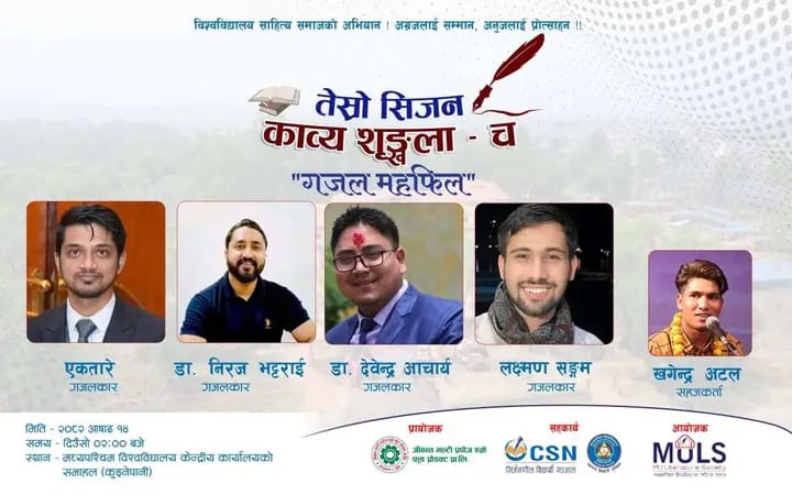 सुर्खेत: मध्यपश्चिम विश्वविद्यालय साहित्य समाजले आगामी असार १४ गते शनिबार “तेस्रो सिजन : काव्य शृङ्खला – च” अन्तर्गत एक आकर्षक गजल महफिलको आयोजना गरेको छ। “विश्वविद्यालय साहित्य समाजको अभियान ,अग्रजलाई सम्मान ,अनुजलाई प्रोत्साहन ।” को सिद्धान्तका साथ अगाडि बढिरहेको यो कार्यक्रमले नेपाली साहित्यिक परिवेशमा नयाँ प्रतिभाहरूलाई मंच प्रदान गर्ने साथै रचनाकारहरूबीच सृजनात्मक आदानप्रदानलाई बढावा दिने उद्देश्य राखेको छ।