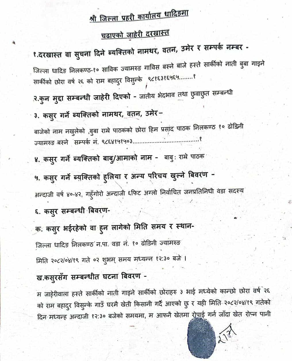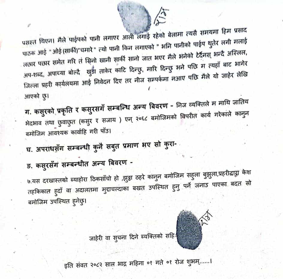 विसुन्केले जाहेरीमार्फत “जातीय भेदभाव तथा छुवाछुत (कसुर र सजाय) ऐन २०६८” विपरीत कार्य भएको भन्दै कानुनअनुसार कारबाही गर्न माग गरेका छन्। आरोपित पाठक करिब ४५–४६ वर्ष उमेरका, नीलकण्ठ–१० निवासी तथा निर्वाचित वडा सदस्य भएको जाहेरीमा उल्लेख छ।
