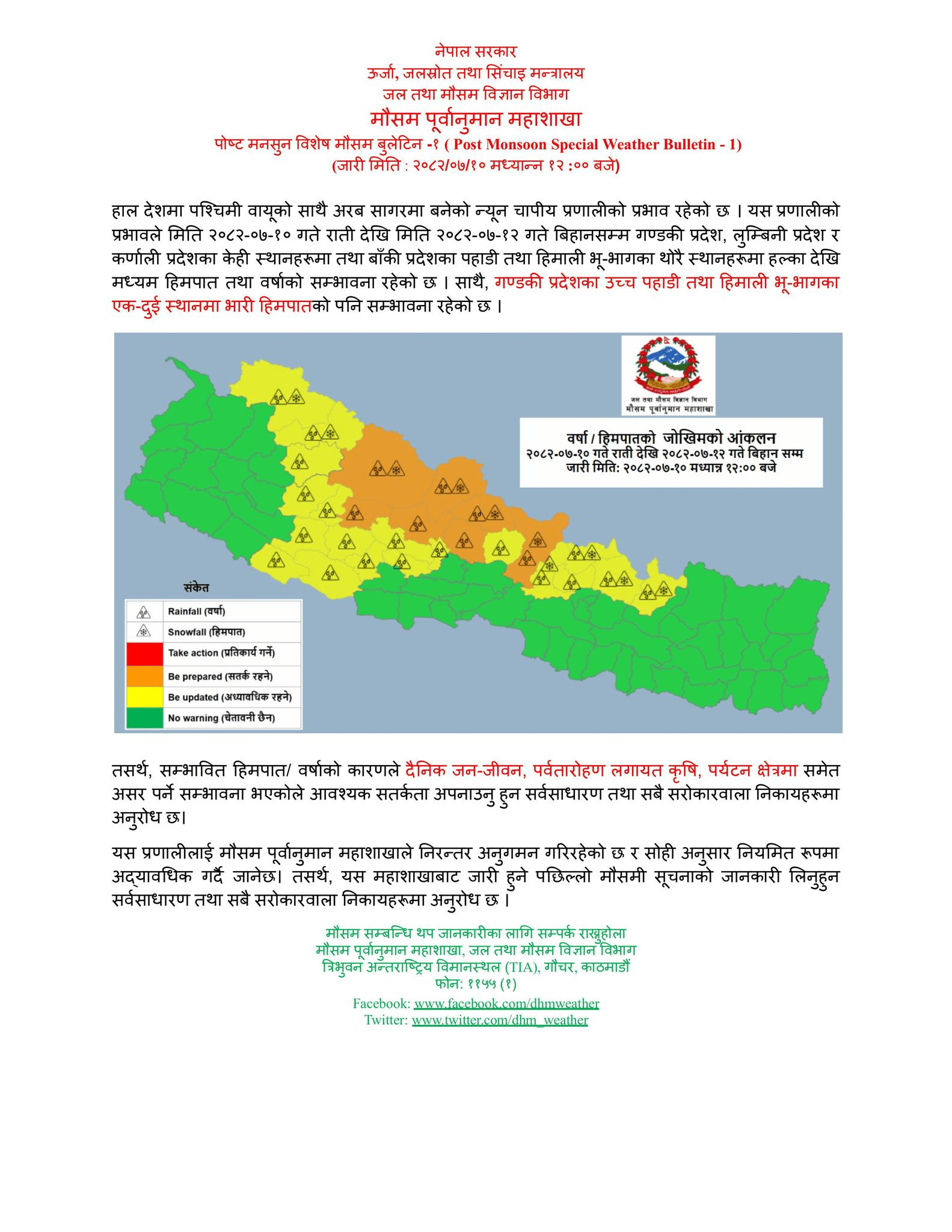 विभागले जारी गरेको पोस्ट मनसुन विशेष मौसम बुलेटिनअनुसार आज रातिदेखि पर्सि बुधबार बिहानसम्म देशका धेरैजसो भागमा बदली भई वर्षा र हिमपात हुने सम्भावना छ।